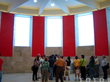 廃墟にあったこの回廊部分は自力で立つことは難しく、支えるための壁を建て、各アーチ部を窓にしてガラスをはめ完全に建物の内部に納めてある。